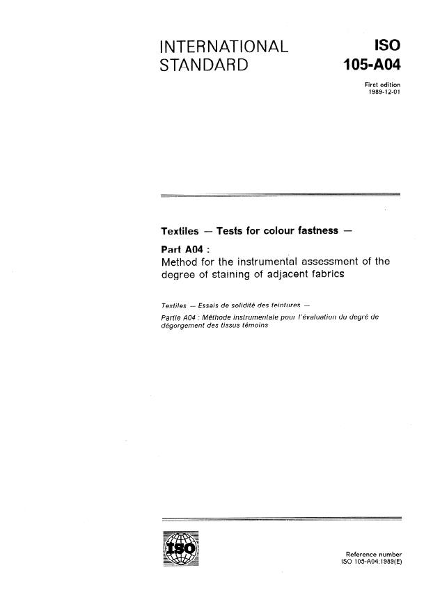 ISO 105-A04:1989 is a standard published by the International Organization for Standardization (ISO). Its full title is "Textiles — Tests for colour fastness — Part A04: Method for the instrumental assessment of the degree of staining of adjacent fabrics". This standard covers: This part of ISO 105 specifies an instrumental method for assessing the degree of staining of adjacent fabrics in any fastness test, as an alternative to the visual method.