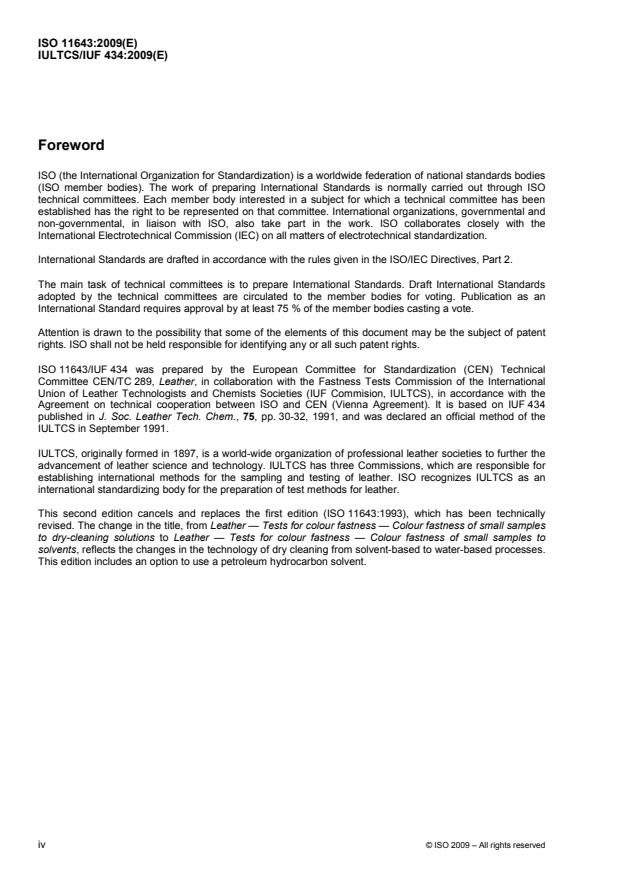 ISO 11643:2009 specifies a method for determining the resistance to solvent solutions of the colour and finish of unused, and not yet cleaned, leather. It does not cover composite materials or complete leather garments. It is not intended to be used to give any guidance on the process to be employed for cleaning garments. During the test, the colour of the leather can change and the adjacent fabric used can become stained. Additionally, the finish of the leather can be damaged. The presence of absorbed water in the leather, adjacent fabric or solvent has not been found to be a critical factor in assessing the colour fastness.