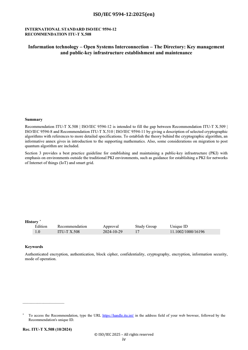 ISO/IEC 9594-12:2025 is a standard published by the International Organization for Standardization (ISO). Its full title is "Information technology - Open systems interconnection - Part 12: The Directory: Key management and public-key infrastructure establishment and maintenance". This standard covers: This Recommendation | International Standard supplements Rec. ITU-T X.509 | ISO/IEC 9594-8 and Rec. ITU-T X.510 | ISO/IEC 9594-11 by providing an extended description of cryptographic algorithms and guidance in establishment and maintenance of a public-key infrastructure (PKI). It is outside the scope of this Recommendation | International Standard to define new cryptographic algorithms, but it is within scope to discuss already-defined cryptographic algorithms that provide optimal protection, including future protection against attacks using powerful quantum computers. This Recommendation | International Standard specifies how public-key infrastructure (PKI) may be adapted to support machine-to-machine (M2M) communication, e.g., smart grid and Internet of things (IoT), to allow interworking. This Recommendation | International Standard specifies the procedures for establishment and maintenance of a PKI supporting new areas, such as intelligent electricity network (smart grid) and industrial Internet of things.