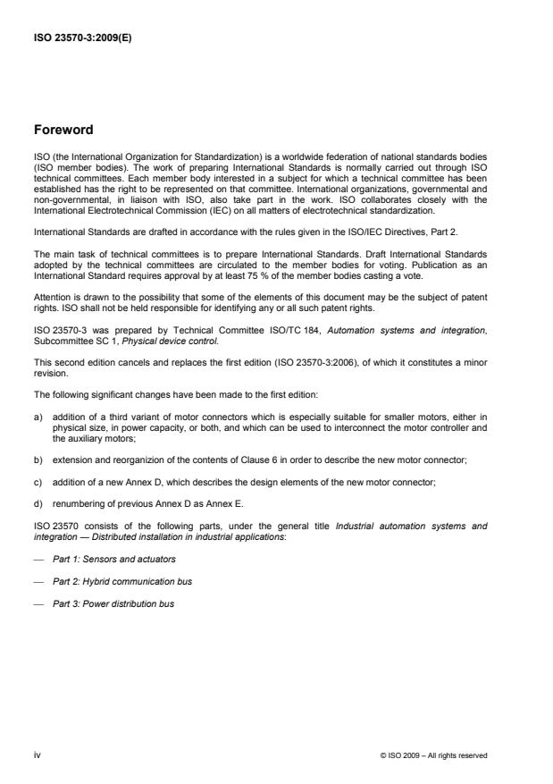 ISO 23570-3:2009 is a standard published by the International Organization for Standardization (ISO). Its full title is "Industrial automation systems and integration - Distributed installation in industrial applications - Part 3: Power distribution bus". This standard covers: ISO 23570 specifies the interconnection of elements in the control system of machine tools and similar large pieces of industrial automation, including cable types, sizes and sheath colours, connector types and contact assignments, and diagnostic functions appropriate to the sensors and actuators. ISO 23570-3:2009 specifies the interconnection of single-phase or three-phase auxiliary motors with their power source. ISO 23570 does not address the design or operation of such equipment with respect to safety issues. It is advisable that appropriate safety standards be consulted for such requirements.