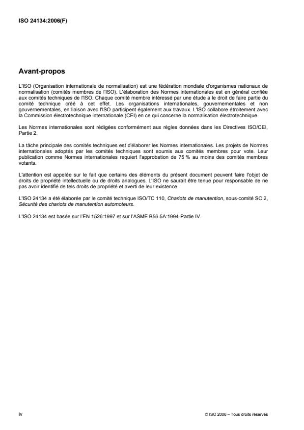 ISO 24134:2006은 산업용 차량에서 자동화된 기능들에 대한 안전 요구 사항을 명시하고 있다. 이에는 조향(직접 기계적인 안내를 제외한), 이동, 상하 작업, 회전, 도달, 회전, 기울기, 클램핑과 같은 화물 조작, 이동의 조합 및/또는 순서 등이 포함된다. ISO 24134:2006은 ISO 3691의 적용 가능한 부분 중 하나 이상과 연계하여 사용되는 것이 목적이다. 그러나 운전자 제어를 초과하는 안전 장비(높이 제한, 속도 제한 장치 등), 극한 조건에서의 운전(극한 기후, 냉동기 적용, 강한 자기장 등), 특수 규칙이 적용되는 환경에서의 운전(잠재적으로 폭발성인 환경), 전자기적 호환성, 승객 운송, 위험 상황을 초래할 수 있는 화물 조작(녹은 금속, 산 / 알칼리, 방사성 물질 등)에 대한 요구 사항은 해당하지 않는다. ISO 3691의 적용 가능한 부분의 범위 제약사항은 ISO 24134:2006에도 적용된다.