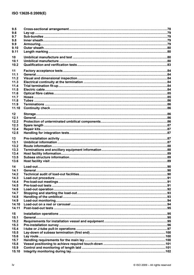 Keywords: ISO 13628-5:2009, subsea umbilicals, umbilical design, umbilical installation, petroleum and natural gas, subsea production systems, electric cable, optical-fibre, hoses, metallic tubes.