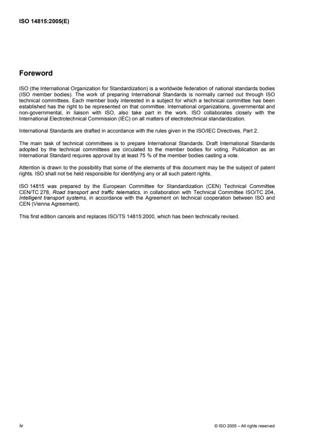 ISO 14815:2005 is classified under the following ICS (International Classification for Standards) categories: 03.220.20 - Road transport; 35.240.60 - IT applications in transport. The ICS classification helps identify the subject area and facilitates finding related standards.