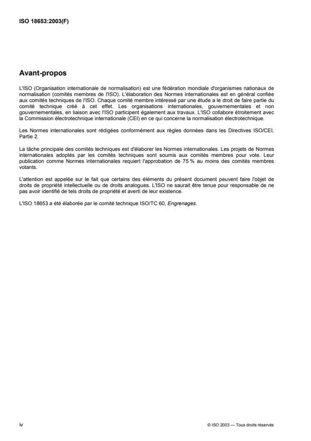 L'ISO 18653:2003 spécifie des méthodes d'évaluation des instruments utilisés pour mesurer la développante de cercle, l'hélice, le pas et le faux-rond de rotation des engrenages. Elle est applicable aussi bien aux instruments qui mesurent le faux-rond directement qu'à ceux qui le calculent à partir de mesures de divisions. L'ISO 18653:2003 donne également des recommandations sur l'évaluation des instruments de mesure de l'épaisseur des dents et, nécessairement, elle inclut une estimation de l'incertitude de mesure à l'aide d'artefacts d'engrenages calibrés. Elle ne traite cependant pas de l'étalonnage des artefacts par des laboratoires accrédités conformément à l'ISO 17025, et ses exigences ne sont pas destinées à servir de base à l'acceptation des engrenages fabriqués (voir l'ISO1328-1, l'ISO1328-2, l'ISO/TR 10064-1 et l'ISO/TR 10064-2). L'estimation de l'incertitude de mesure des engrenages fabriqués n'entre pas dans son domaine d'application (voir pour cela l'ISO/TR 10064-5).