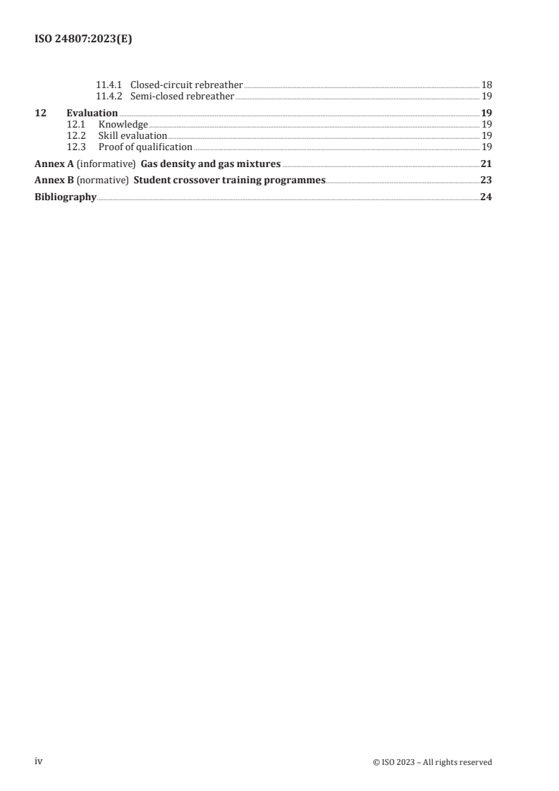 ISO 24807:2023 is a standard published by the International Organization for Standardization (ISO). Its full title is "Recreational diving services - Requirements for rebreather diver training - Decompression diving to 100 m". This standard covers: This document specifies requirements for rebreather diver training programmes which provide the competencies required to perform dives to 100 m with a rebreather using a breathing mixture containing helium and requiring mandatory decompression stops. This document specifies evaluation criteria for these competencies. This document specifies the requirements under which training is provided, in addition to the general requirements for recreational diving service provision in accordance with ISO 24803.