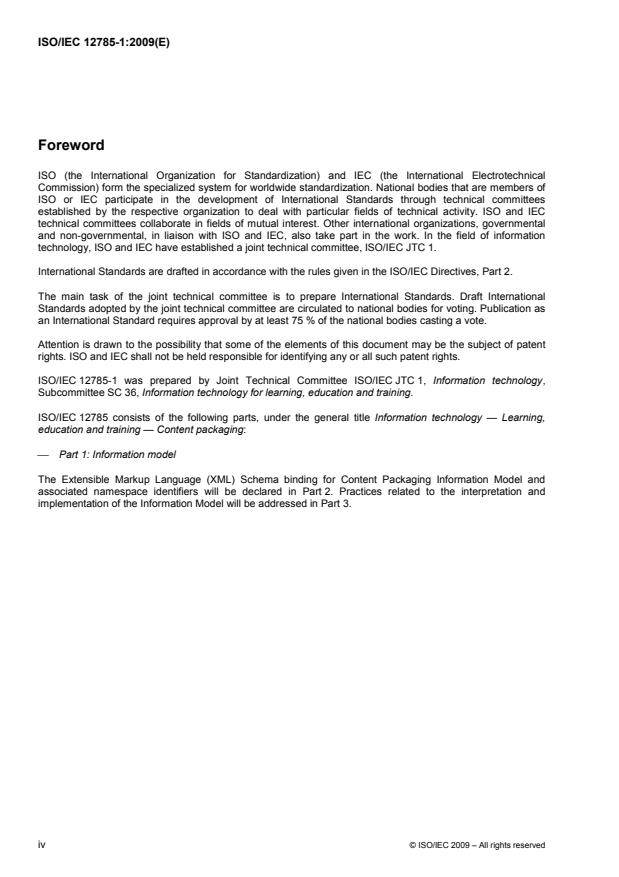 ISO/IEC 12785-1:2009 specifies the Content Packaging Information Model for exchanging learning, education and training (LET) content between systems. Often referenced as the internationalization of IMS Content Packaging, this standard defines the conceptual model and the data structures used to import, export, aggregate and disaggregate LET packages. It documents the manifest-based approach for describing resources, organizations, metadata and file locations, and it clarifies compatibility with widely used profiles such as SCORM and IMS Content Packaging.