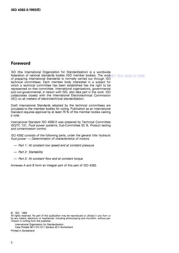 ISO 4392-3:1993 is a standard published by the International Organization for Standardization (ISO). Its full title is "Hydraulic fluid power - Determination of characteristics of motors - Part 3: At constant flow and at constant torque". This standard covers: Describes a method of determining the low-speed characteristics of positive-displacement rotary fluid power motors under constand flow and constant torque conditions. The method involves testing at slow speeds, which may generate frequencies having a significant influence upon the steady continuous torque output of the motor and affect the system to which the motor would be connected. The accuracy of measurement is divided into three classes, A, B and C, which are explained in annex A.