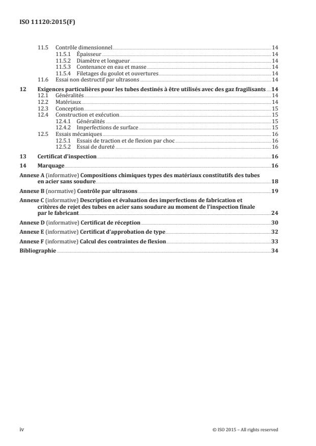 L'ISO 11120:2015 spécifie les exigences minimales relatives au matériau, à la conception, à la construction et à l'exécution, aux procédés de fabrication, aux contrôles et aux essais au moment de la fabrication des tubes en acier sans soudure, trempés et revenus, rechargeables, d'une contenance en eau de plus de 150 litres à 3 000 litres inclus, destinés aux gaz comprimés et liquéfiés exposés à des températures ambiantes extrêmes, généralement comprises entre ?50 °C et 65 °C. L'ISO 11120:2015 s'applique aux tubes de résistance à la traction maximale, Rma, inférieure à 1 100 MPa. Ces tubes peuvent être utilisés seuls ou en batteries afin d'équiper des remorques ou des conteneurs à gaz à éléments multiples (modules ISO ou skids) pour le transport et la distribution de gaz comprimés. L'ISO 11120:2015 est applicable aux tubes ayant une ouverture à chaque extrémité.