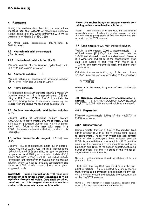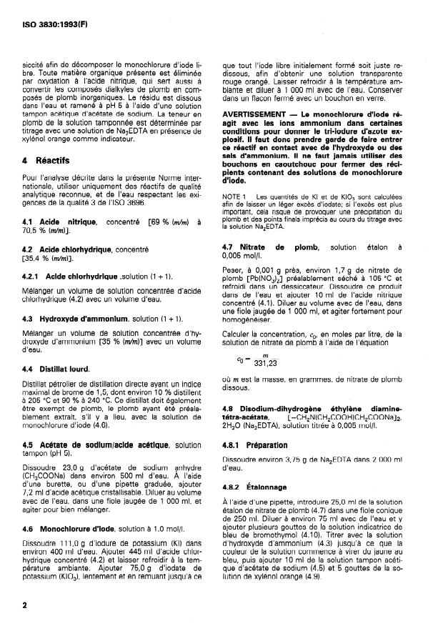 ISO 3830:1993 is a standard published by the International Organization for Standardization (ISO). Its full title is "Petroleum products - Determination of lead content of gasoline - Iodine monochloride method". This standard covers: Specifies a procedure for total lead as lead alkyls at concentrations between 0,026 g and 1,300 g of lead per litre. The method is not apllicable to gasoline containing manganese anti-knock additives.