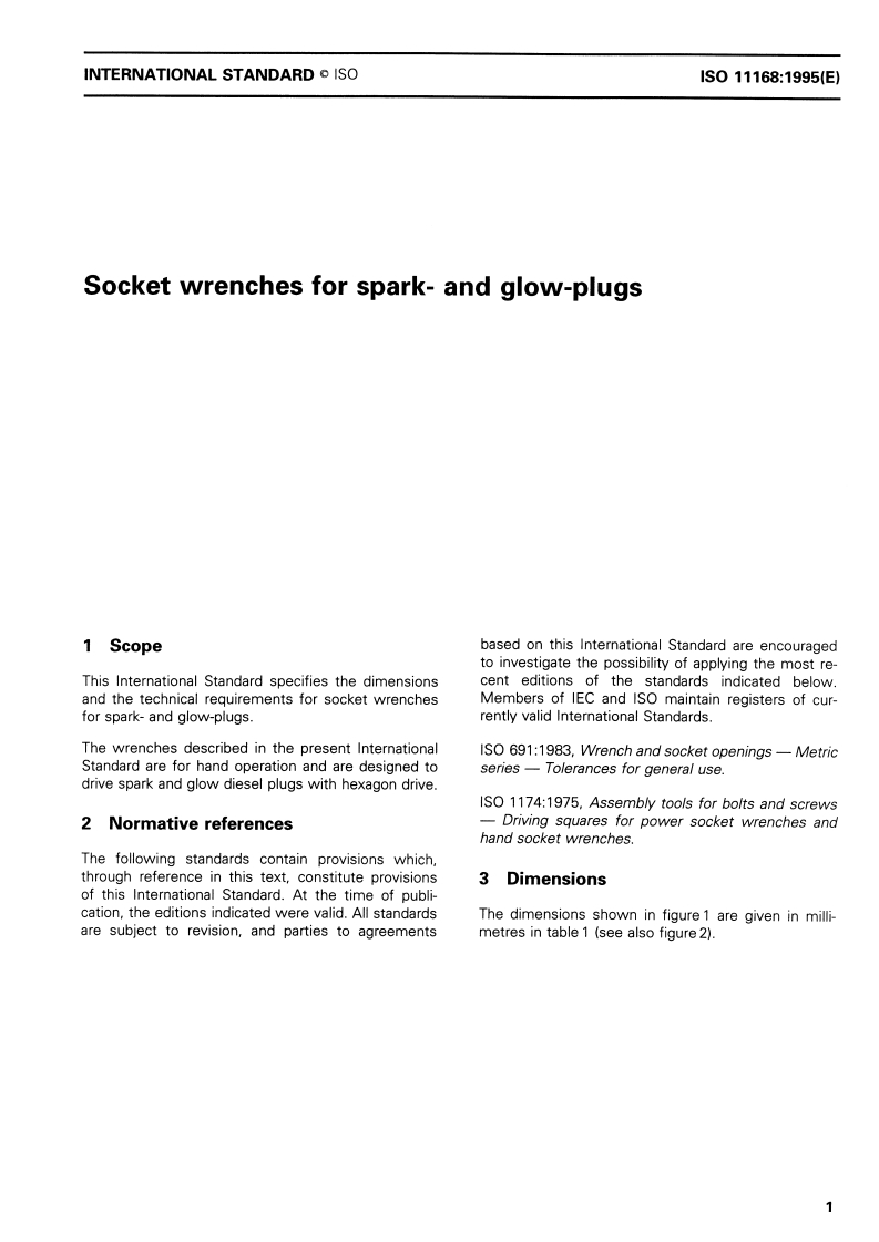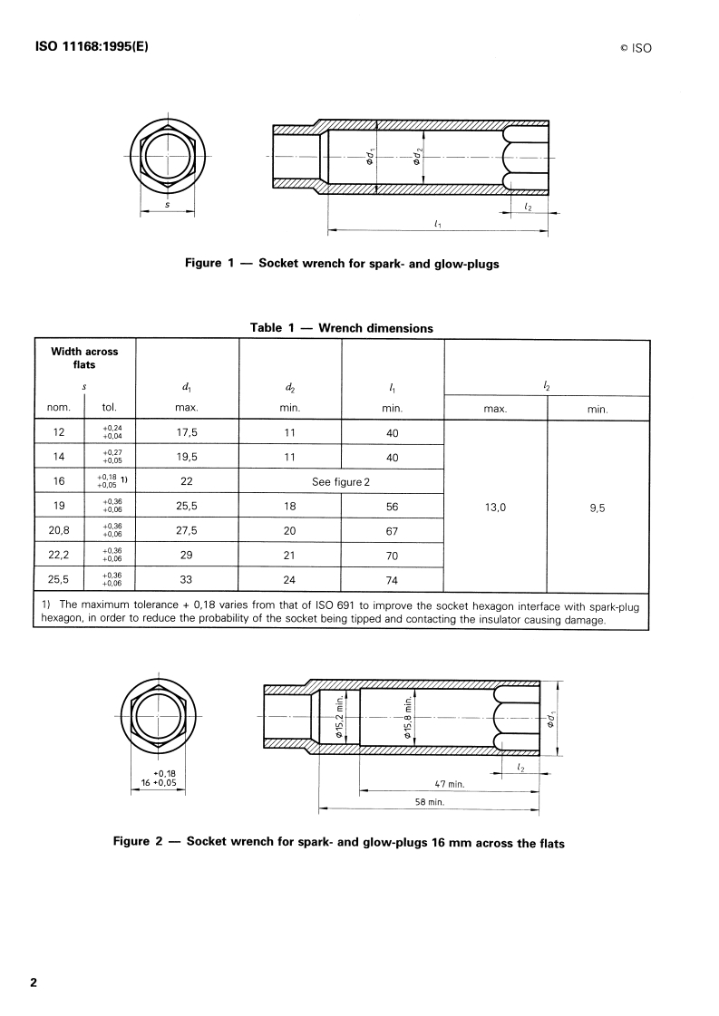 Keywords: ISO 11168, socket wrenches for spark‑ and glow‑plugs, spark‑plug socket, glow‑plug socket, dimensions, technical requirements, hand tools, test torque, ISO 691, ISO 1174.