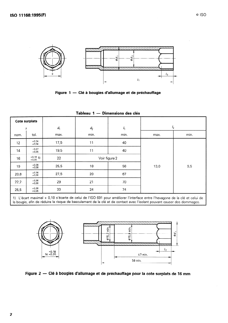 - Marking and designation: Sockets must be permanently marked with the manufacturer name/brand and the across‑flats size. Standardized designation examples are provided (e.g., “Clé à bougies ISO 11168 - 19 - I - 12,5”).
