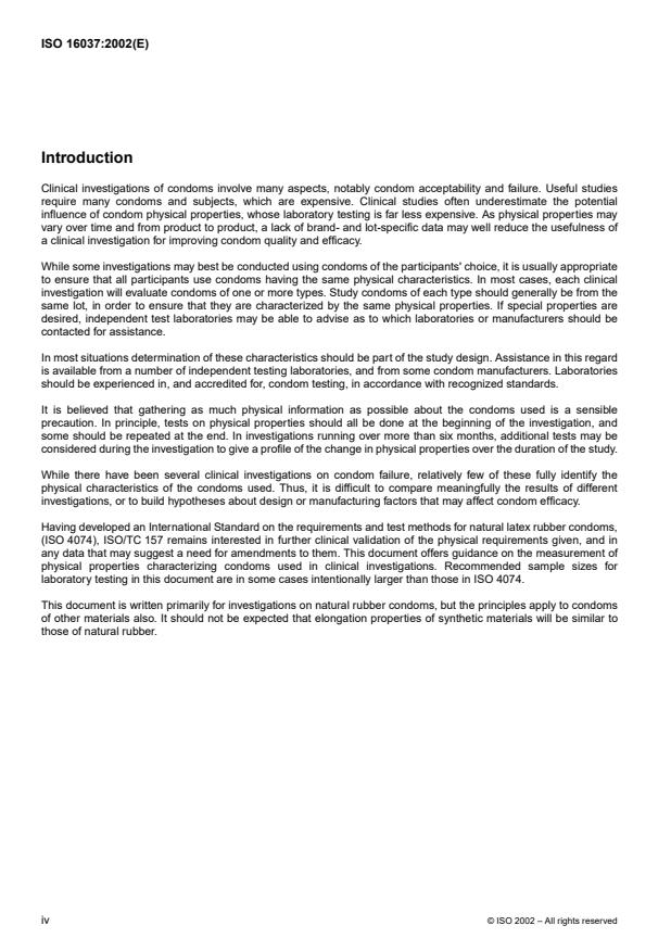 ISO 16037:2002 - "Rubber condoms for clinical trials - Measurement of physical properties" is a practical guideline for clinical researchers and testing laboratories. It describes a set of laboratory tests and sampling recommendations to characterize the physical properties of condoms used in clinical investigations. The standard is intended to help relate clinical outcomes (acceptability, failure rates) to the design and quality of the condoms tested and is not a protocol for clinical trial design. Although written mainly for natural rubber condoms, the principles can be applied to other materials.