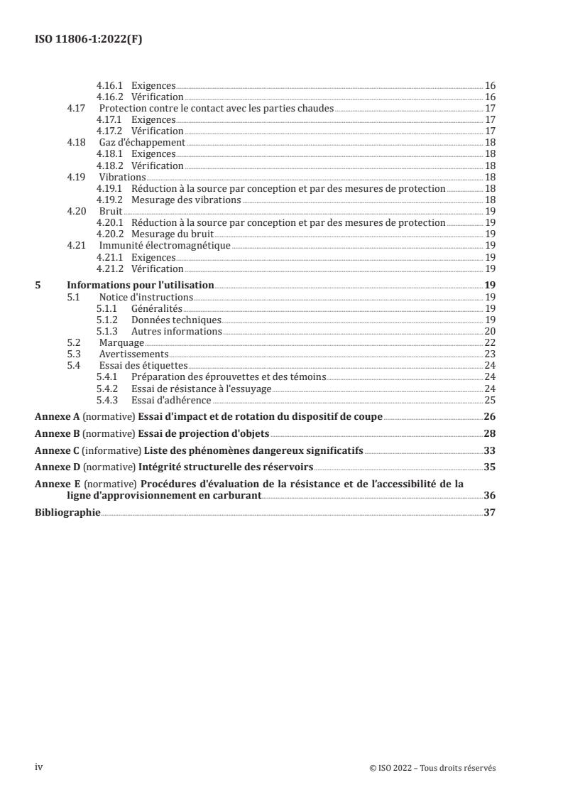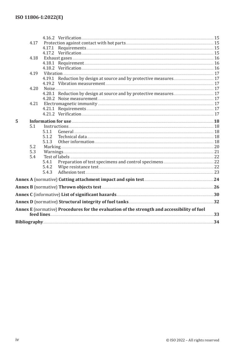 ISO 11806-1:2022 is a standard published by the International Organization for Standardization (ISO). Its full title is "Agricultural and forestry machinery - Safety requirements and testing for portable, hand-held, powered brush-cutters and grass-trimmers - Part 1: Machines fitted with an integral combustion engine". This standard covers: This document gives safety requirements and measures for their verification for the design and construction of portable hand-held, powered brush-cutters and grass-trimmers (hereafter called machines) having an integral combustion engine as their power unit and mechanical power transmission between the power source and the cutting attachment. Methods for the elimination or reduction of hazards arising from the use of these machines and the type of information on safe working practices to be provided by the manufacturer are specified. This document deals with all significant hazards, hazardous situations and hazardous events relevant to these machines, as well as when they are used as intended and under conditions of misuse which are reasonably foreseeable by the manufacturer. This document is not applicable to machines equipped with metallic cutting attachments consisting of more than one piece, such as pivoting chains or flail blades. NOTE See Annex C for a list of significant hazards. This document is applicable to portable, hand-held, powered brush-cutters and grass-trimmers manufactured after its date of publication.
