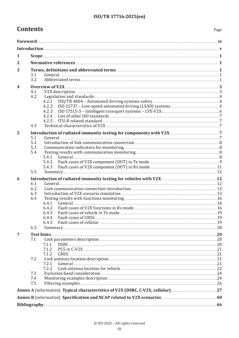 ISO/TR 17716:2025 is a technical report published by the International Organization for Standardization (ISO). Its full title is "Road vehicles - Electrical disturbances from narrowband radiated electromagnetic energy - Radiated immunity for V2X". This standard covers: This document describes the introduction of radiated immunity testing for the components and vehicles equipped with V2X communications. The link communication connection and V2X scenario simulation are considered to make the V2X functions and their communications operate normally during the immunity testing. Examples of monitoring are also discussed to show the electromagnetic interference reactions of the device with V2X under test. In addition, test hints are described to provide information on radiated immunity for V2X. Technical specifications are not within the scope of this document.