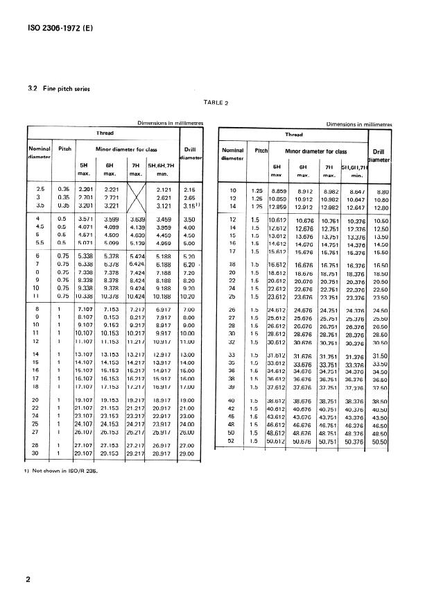 ISO 2306:1972 is a standard published by the International Organization for Standardization (ISO). Its full title is "Drills for use prior to tapping screw threads". This standard covers: Specifies the sizes of these drills for ISO metric threads (tables 1 and 2). ISO inch threads (tables 3 and 4) and pipe threads (tables 5 and 6). Applies to screw threads of normal length of engagement, the drill diamter being approximately equal to the nominal diameter of the thread minus the pitch. The sizes (except for those sizes indicated by an asterisk) have been selected from ISO 235 and are to be used in the future.