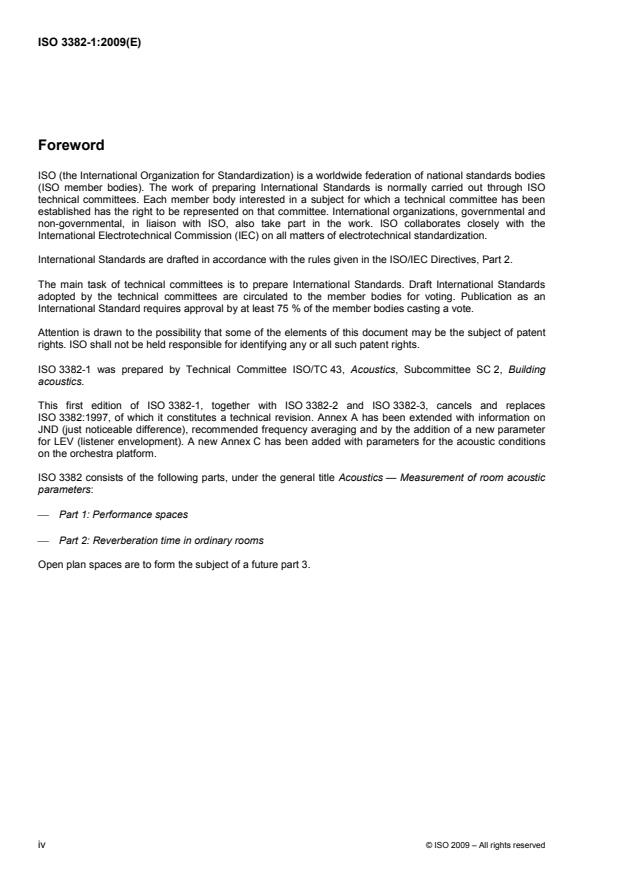 ISO 3382-1:2009 - "Acoustics - Measurement of room acoustic parameters - Part 1: Performance spaces" specifies standardized methods for measuring reverberation time and other room acoustical parameters in performance spaces (concert halls, theatres, auditoria). The standard defines measurement procedures, required apparatus, coverage (positioning and spatial averaging), data evaluation from impulse responses, and test-report presentation. It is intended for modern digital measuring techniques and for deriving auditorium measures from recorded impulse responses.