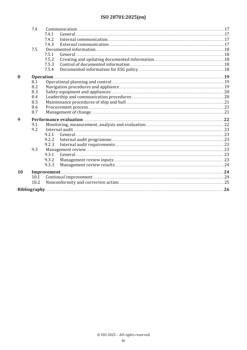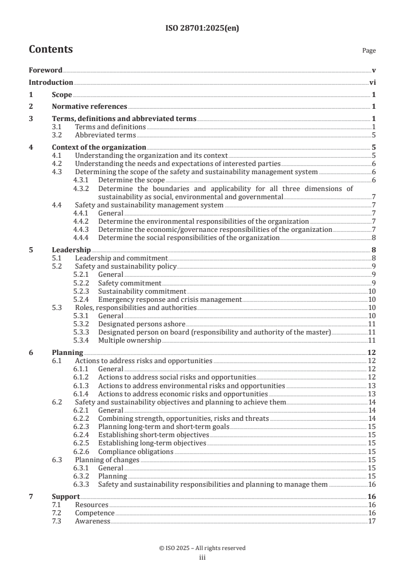 ISO 28701:2025 is a standard published by the International Organization for Standardization (ISO). Its full title is "Inland navigation and commercial shipping - Safety and sustainability management systems - Requirements and guidance for use". This standard covers: This document provides requirements and guidance for implementing a safety and sustainability management system for commercial shipping on inland waterways. The document is tailored toward navigation on the inland waterways, including but not limited to rivers and lakes. It applies to freight, cruise, ferries and passenger vessels larger than 24 m in length on inland waterways and land-based operations supporting ships. This document is aligned with the ISM Code[14] and is also applicable to sea going vessels when sailing on inland waterways.