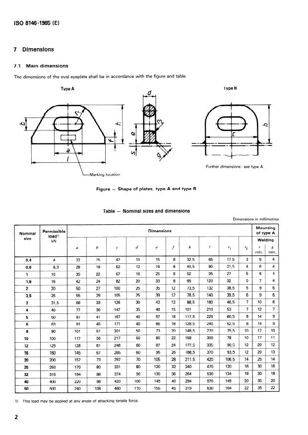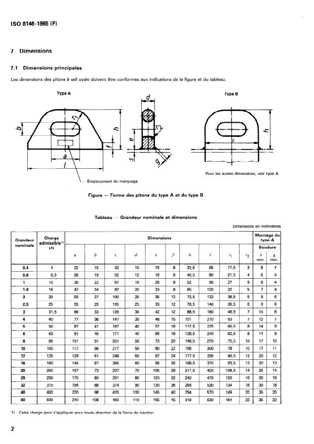 - The standard includes detailed figures and a dimension table (millimetres) correlating nominal sizes with main dimensions and permissible loads.