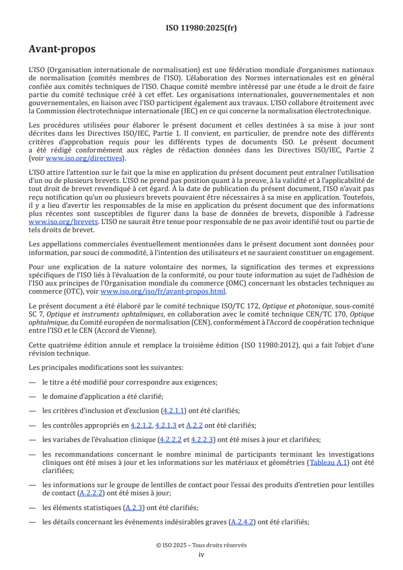 ISO 11980:2025 is a standard published by the International Organization for Standardization (ISO). Its full title is "Ophthalmic optics - Contact lenses and contact lens care products - Requirements and guidance for clinical investigations". This standard covers: This document gives requirements and guidelines for the clinical investigation (CI) to establish the safety and performance of contact lenses and contact lens care products. NOTE 1 This document attempts to align the recognised regulatory requirements for the conduct of a CI to meet the marketing and labelling requirements for contact lenses and contact lens care products around the world. However, national requirements vary greatly. Wherever national practice or regulations dictate some legal requirement, this requirement takes precedence over this document. NOTE 2 For indications beyond correction of refractive error, additional considerations for safety and performance are to be included in the clinical investigation plan (CIP).