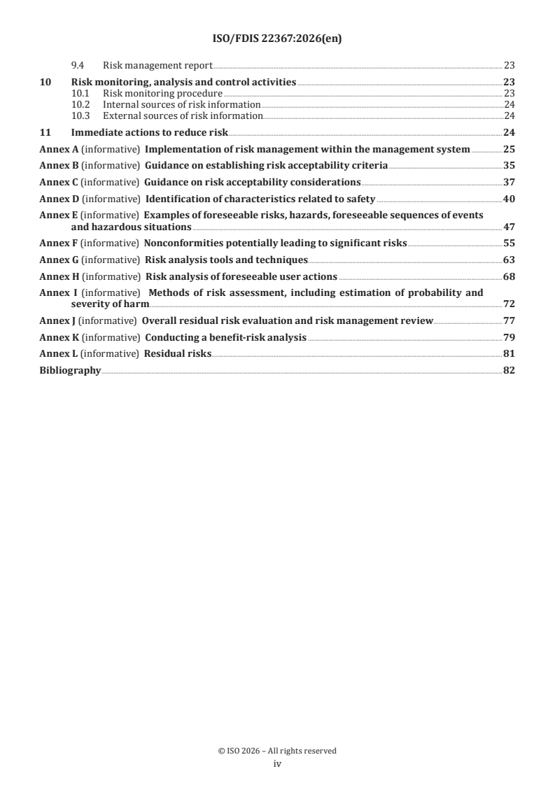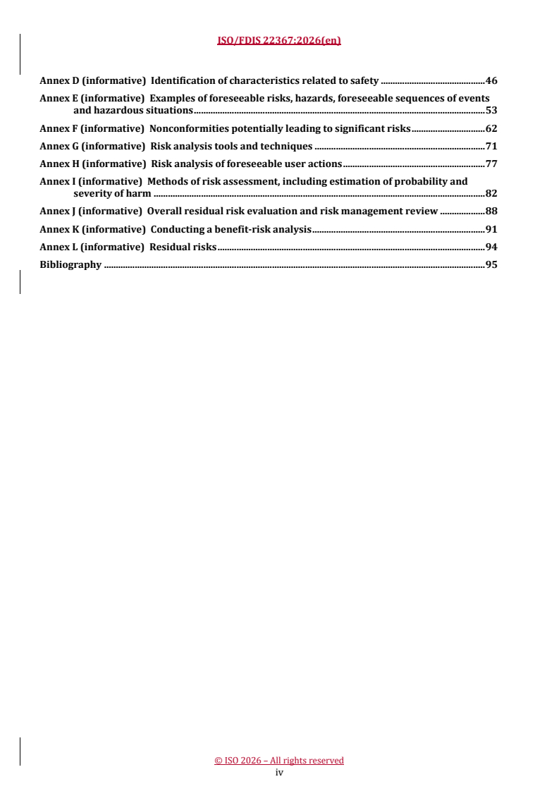 - Informative annexes with guidance on acceptability criteria, risk analysis tools, foreseeable hazards, nonconformities, and benefit‑risk methods.