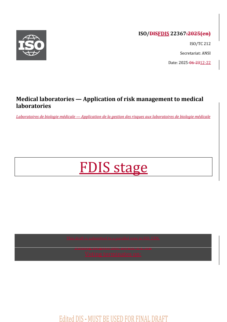 REDLINE ISO/FDIS 22367 - Medical laboratories — Application of risk management to medical laboratories Released:23. 12. 2025
