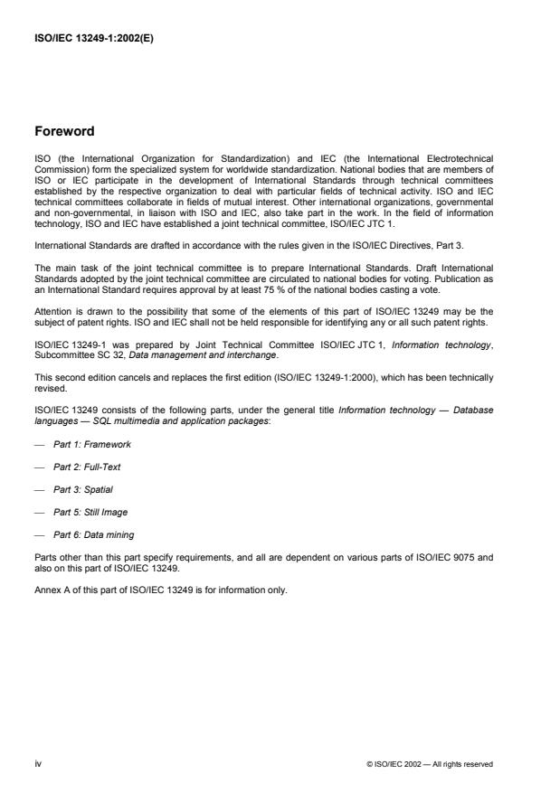 ISO/IEC 13249-1:2002 is a standard published by the International Organization for Standardization (ISO). Its full title is "Information technology — Database languages — SQL multimedia and application packages — Part 1: Framework". This standard covers: ISO/IEC 13249 defines a number of packages of generic data types common to various kinds of data used in multimedia and application areas, to enable that data to be stored and manipulated in an SQL database. The package in each subject area is defined as a part of ISO/IEC 13249. ISO/IEC 13249-1:2002 defines those concepts, notations and conventions that are common to two or more other parts of ISO/IEC 13249. In particular it describes the way ISO/IEC 9075 is used in other parts to define the user-defined types and their behaviour appropriate to each subject area.