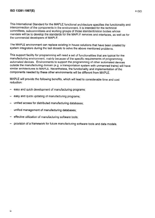 ISO 13281:1997 is a standard published by the International Organization for Standardization (ISO). Its full title is "Industrial automation systems - Manufacturing Automation Programming Environment (MAPLE) - Functional architecture". This standard covers: The document specifies the functional architecture of MAPLE, a Manufacturing Automation Programming Environment. MAPLE is a vendor-independent neutral facility for the programming of multiple manufacturing devices and controls. For the programming of manufacturing devices and controls the following areas will be supported: Connection between various manufacturing data and manufacturing application programs; management of several manufacturing databases; sharing of manufacturing application programs and software tools.