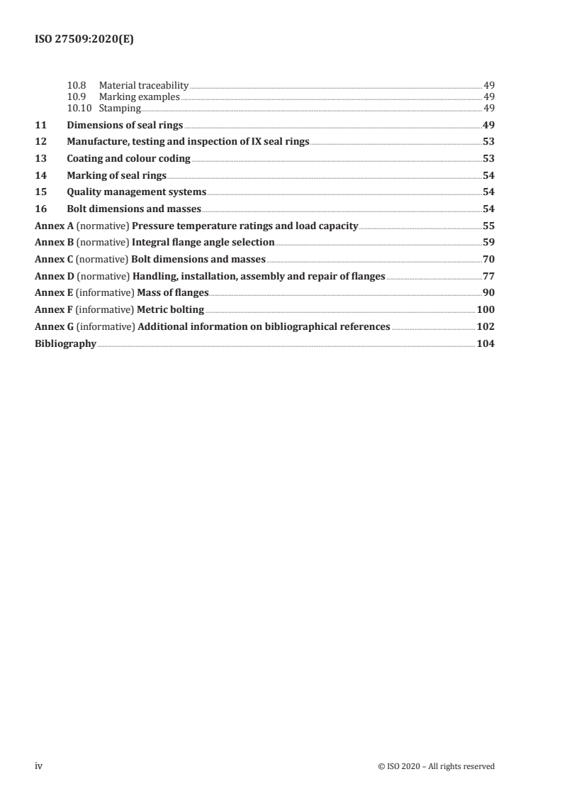ISO 27509:2020 is a standard published by the International Organization for Standardization (ISO). Its full title is "Petroleum and natural gas industries - Compact flanged connections with IX seal ring". This standard covers: This document specifies detailed manufacturing requirements for circular steel and nickel alloy compact flanged connections and associated seal rings, for designated pressures and temperatures in class designations CL 150 (PN 20) to CL 1500 (PN 260) for nominal sizes from DN 15 (NPS ½) to DN 1200 (NPS 48), and for CL 2500 (PN 420) for nominal sizes from DN 15 (NPS ½) to DN 600 (NPS 24). NOTE NPS is expressed in accordance with ASME B36.10M and ASME B36.19M. This document is applicable to welding neck flanges, blind flanges, paddle spacers and spacer blinds (paddle blanks), valve/equipment integral flanges, orifice spacers, reducing threaded flanges and rigid interfaces for use in process piping for the petroleum, petrochemical and natural gas industries. This document is applicable within a temperature range from −196 °C to +250 °C. This document is not applicable for external pressure.