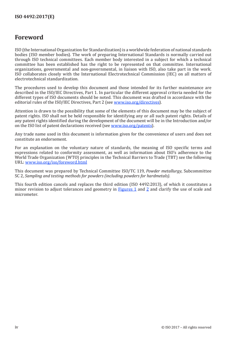ISO 4492:2017 is a standard published by the International Organization for Standardization (ISO). Its full title is "Metallic powders, excluding powders for hardmetals - Determination of dimensional changes associated with compacting and sintering". This standard covers: ISO 4492 specifies a method by which the dimensional changes associated with compacting and sintering of metallic powders are compared with those of a reference powder when processed under similar conditions (see Clause 4). The method applies to the determination of three types of dimensional changes involved with the processing of metallic powders, excluding powders for hardmetals.