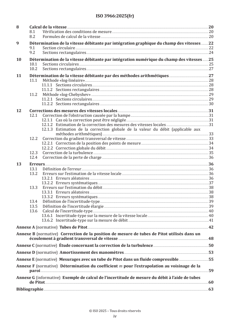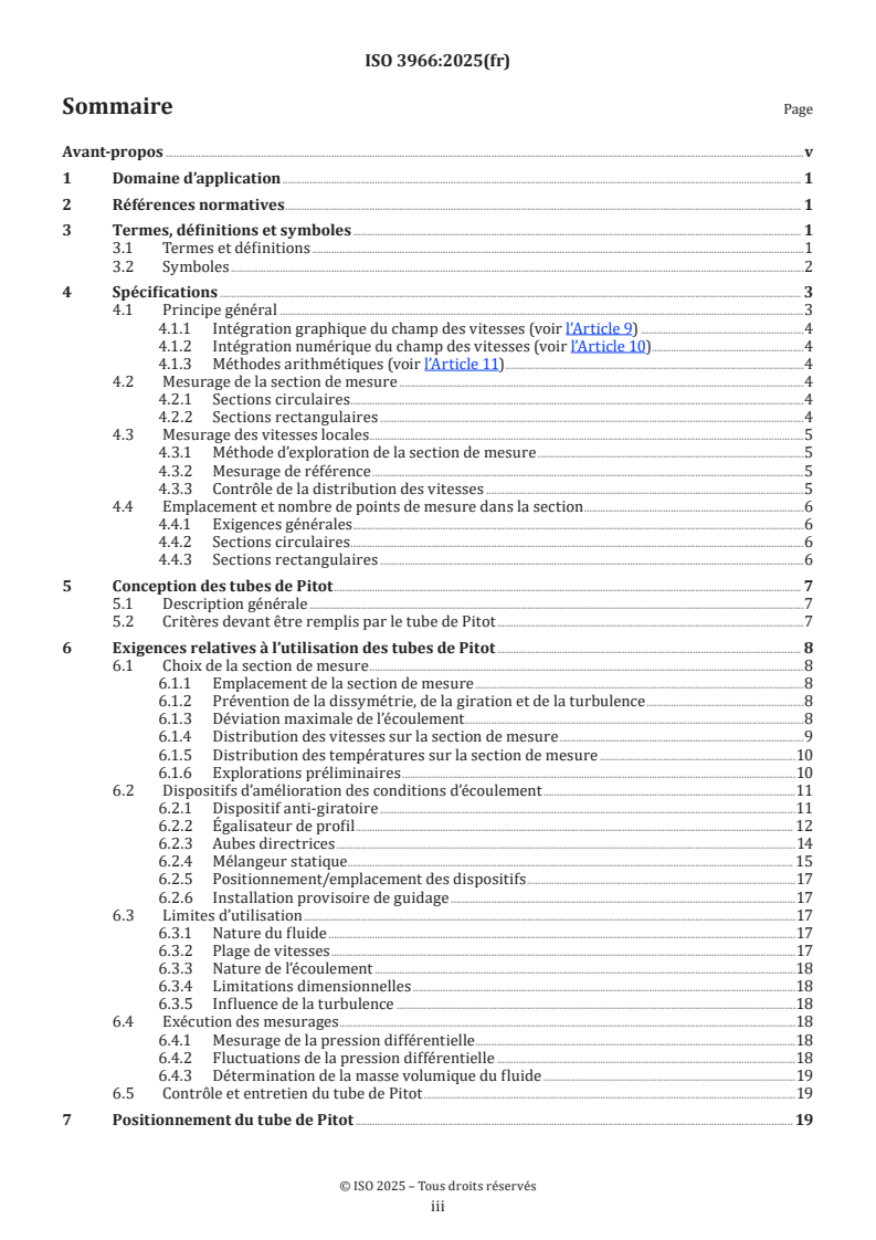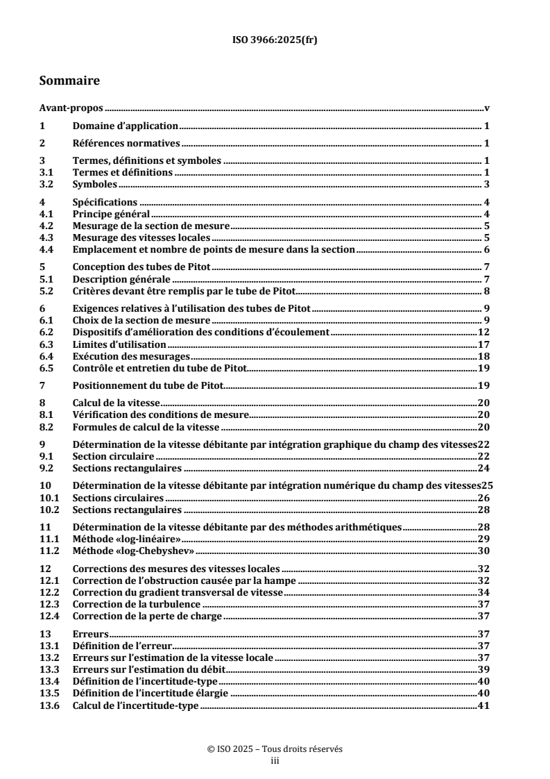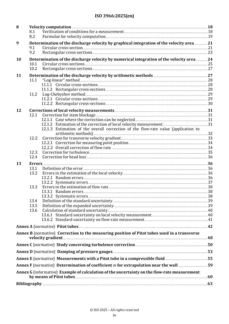ISO 3966:2025 is a standard published by the International Organization for Standardization (ISO). Its full title is "Measurement of fluid flow in closed conduits - Velocity area method using Pitot static tubes". This standard covers: This document specifies a method for the determination in a closed conduit of the volume rate of flow of a regular flow a) of a fluid of substantially constant density or corresponding to a Mach number not exceeding 0,25, b) with substantially uniform stagnation temperature across the measuring cross-section, c) running full in the conduit, and d) under steady flow conditions. In particular, it deals with the technology and maintenance of Pitot static tubes, with the calculation of local velocities from measured differential pressures and with the computation of the flow rate by velocity integration.
