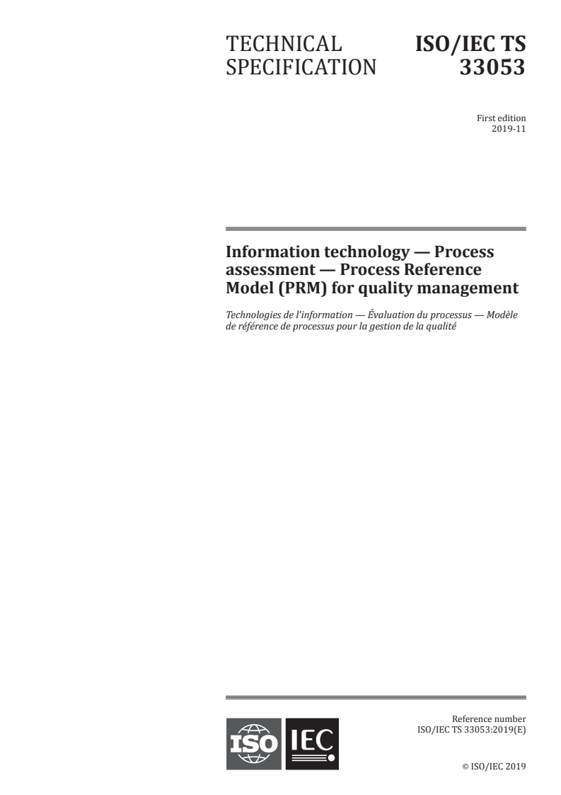 ISO/IEC TS 33053:2019 is a technical specification published by the International Organization for Standardization (ISO). Its full title is "Information technology - Process assessment - Process Reference Model (PRM) for quality management". This standard covers: This document defines a process reference model for the domain of quality management. The model specifies a process architecture for the domain and comprises a set of processes. Each process is described in terms of process purpose and outcomes. NOTE Users of this document can freely reproduce the detailed descriptions contained in this process reference model as part of any tool or other material to support the performance of process assessments, so that it can be used for its intended purpose.
