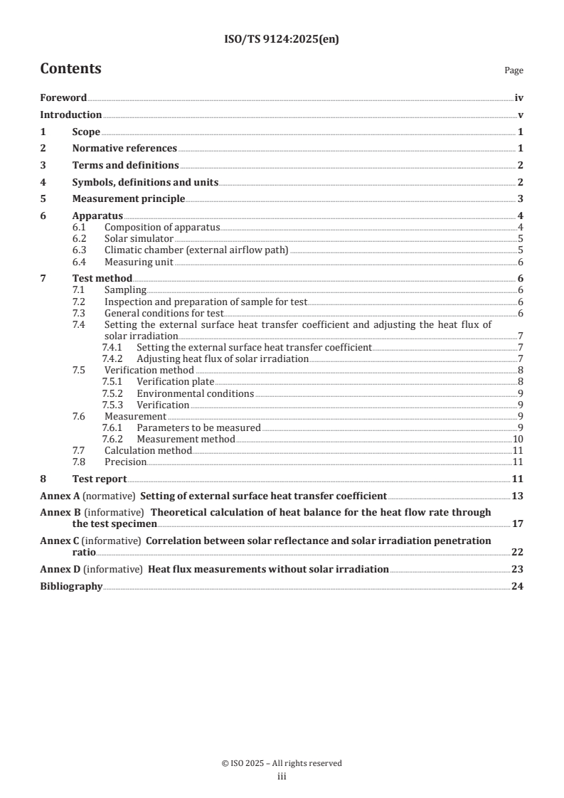 ISO/TS 9124:2025 is a technical specification published by the International Organization for Standardization (ISO). Its full title is "Paints and varnishes - Thermal performance of paint films - Determination of solar irradiation penetration ratio with heat flow meter". This standard covers: This document specifies the heat flow measurement method of the solar irradiation penetration ratio of paint films used for roofs and outer walls of buildings, structures, equipment or facilities situated outdoors and exposed to solar irradiation.