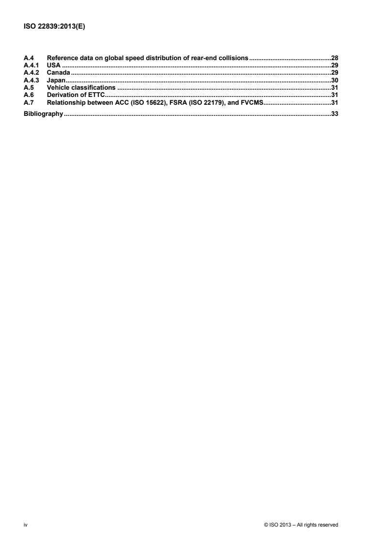 ISO 22839:2013 specifies the concept of operation, minimum functionality, system requirements, system interfaces, and test methods for Forward Vehicle Collision Mitigation Systems (FVCMS). It specifies the behaviors that are required for FVCMS, and the system test criteria necessary to verify that a given implementation meets the requirements of ISO 22839:2013. Implementation choices are left to system designers, wherever possible.