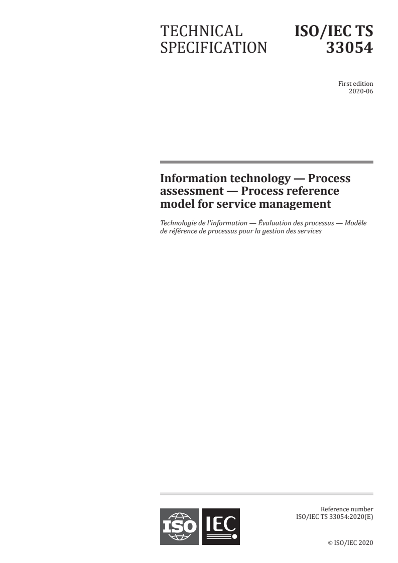 ISO/IEC TS 33054:2020 is a technical specification published by the International Organization for Standardization (ISO). Its full title is "Information technology - Process assessment - Process reference model for service management". This standard covers: This document defines a process reference model for the domain of service management. The model specifies a process architecture for the domain and comprises a set of processes. Each process is described in terms of process purpose and outcomes. The process reference model in this document is directed at assessment sponsors and competent assessors who wish to select a model, and associated documented process method, for assessment (for either capability determination or process improvement).