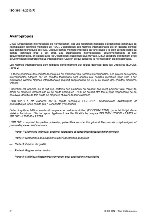 L'ISO 3601-1:2012 spécifie les diamètres intérieurs, sections, tolérances et code d'identification dimensionnelle pour les joints toriques utilisés dans les transmissions hydrauliques et pneumatiques pour des applications industrielles générales et aérospatiales. Les dimensions et tolérances spécifiées dans l'ISO 3601-1:2012 conviennent à n'importe quel matériau élastomère, pourvu qu'un outillage convenable soit utilisé.