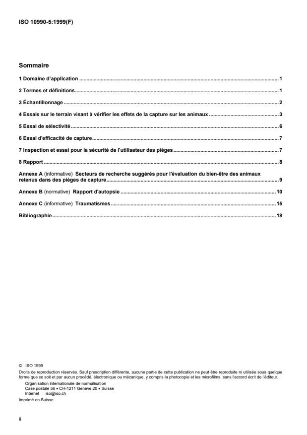 ISO 10990-5:1999 is a standard published by the International Organization for Standardization (ISO). Its full title is "Animal (mammal) traps - Part 5: Methods for testing restraining traps". This standard covers: 1.1 This part of ISO 10990 specifies methods for use in performance testing of traps used on land to restrain mammals. The performance testing includes methods for evaluation of trauma, selectivity, capture efficiency and user safety. 1.2 It is recognized that injury is only one component of animal welfare. However, there are insufficient data collected in a scientific manner on the additional components to allow for the complete assessment of animal welfare. Several areas of investigation are presented for evaluation in annex A. Selection of the data collection methodology is left to the investigator. However, it is assumed that such collection methods will follow accepted practices. It should also be understood that data collected in any, or all, of the suggested areas will probably not provide an absolute measure of welfare. Rather, the compilation of such data over time should provide a mechanism for comparing the relative animal welfare impacts of different restraint methods.