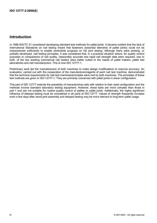ISO 12777-2:2000 defines laboratory test methods for measuring the axial resistance of pallet nails and staples - specifically the withdrawal resistance (nail/staple pulled out of the material) and head pull-through resistance (nail head pulling through a sheet or component). It covers tests for wood-to-wood joints and for joints with wood-based and non-wood-based materials, and applies to nails up to 7 mm diameter and to common staple types.