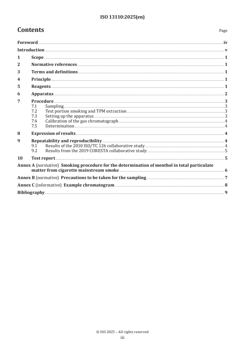 Keywords: ISO 13110:2025, menthol determination, gas chromatographic method, total particulate matter (TPM), mainstream cigarette smoke, ISO 3308, ISO 4387, GC‑FID, DB‑WAX, tobacco testing, calibration, internal standard.