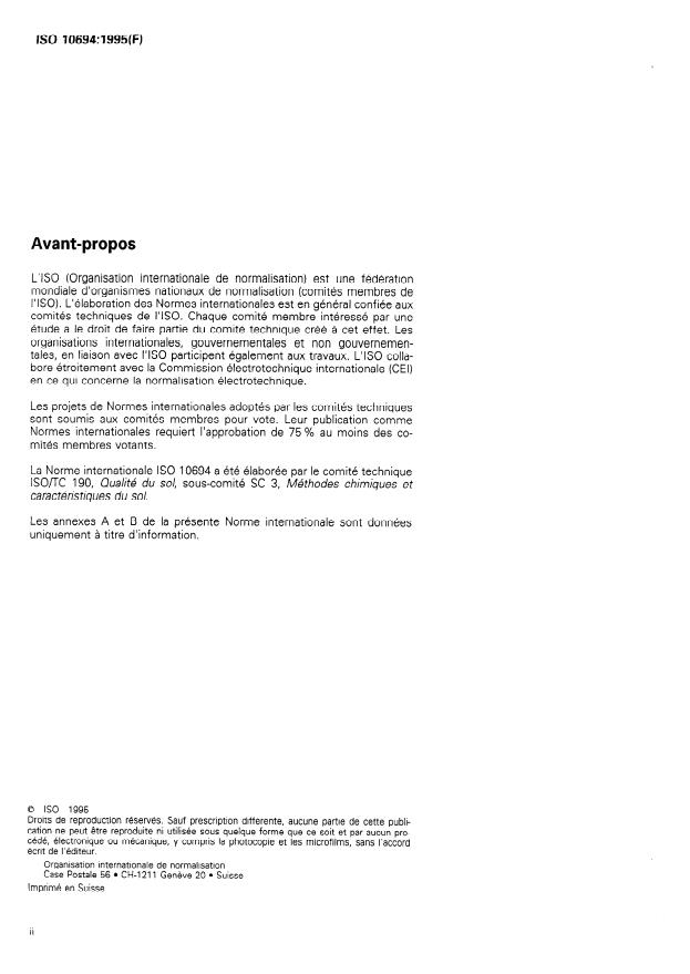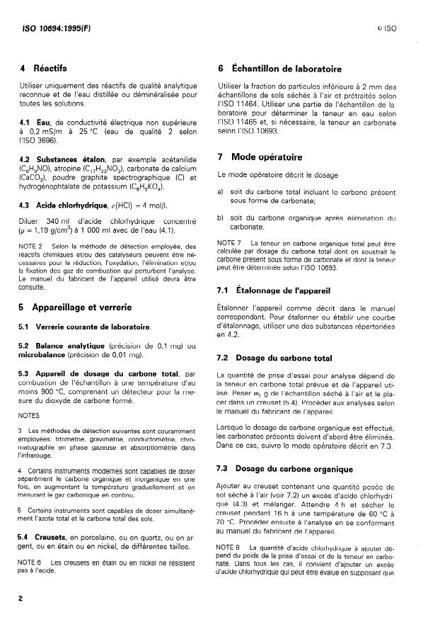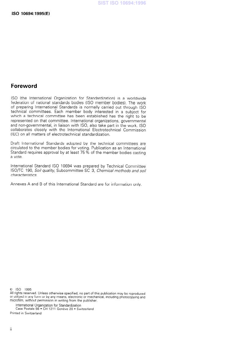 ISO 10694:1995 is a standard published by the International Organization for Standardization (ISO). Its full title is "Soil quality - Determination of organic and total carbon after dry combustion (elementary analysis)". This standard covers: Specifies a method for the determination of the total carbon content in soil after dry combustion. The organic carbon content is calculated from this content after correcting for carbonates present in the sample. If carbonates are removed beforehand, the organic carbon content is measured directly. Applicable to all types of air-dried soil samples.