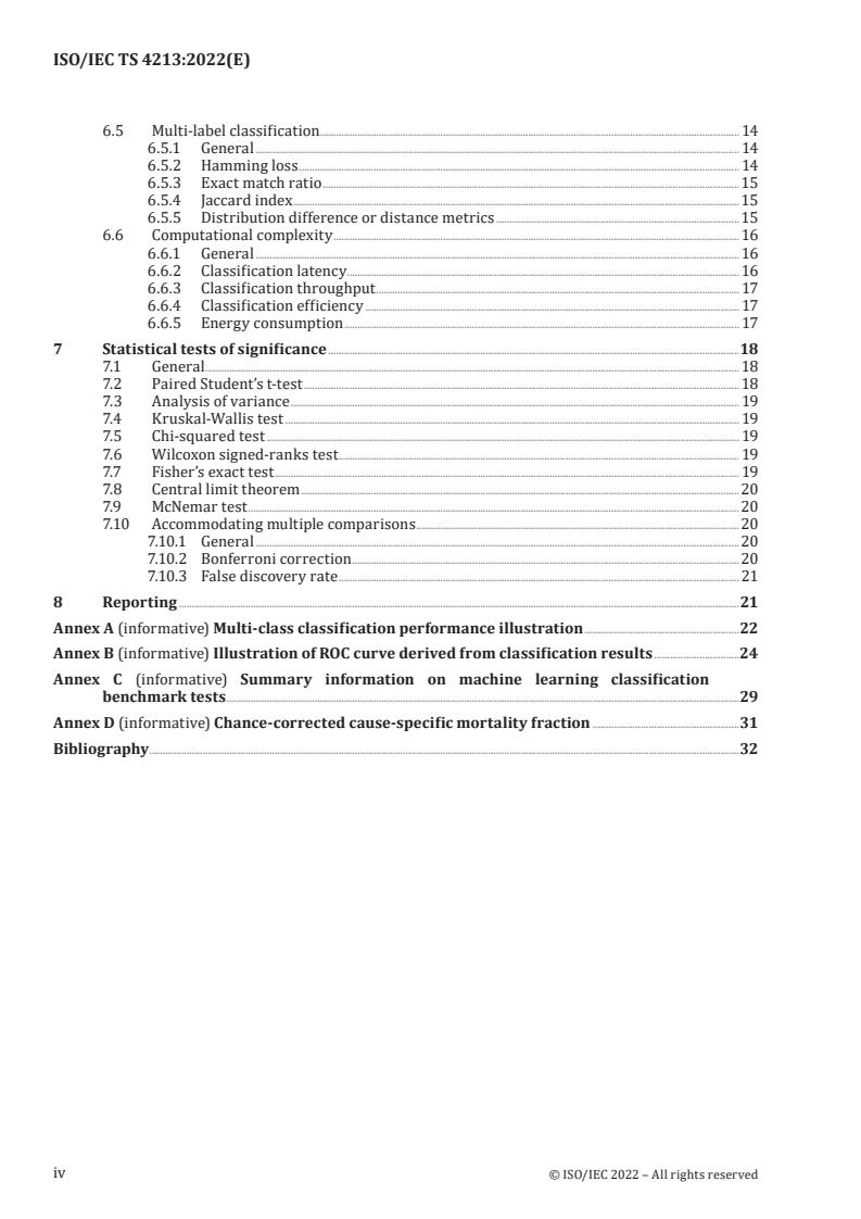 ISO/IEC TS 4213:2022 is a technical specification published by the International Organization for Standardization (ISO). Its full title is "Information technology - Artificial intelligence - Assessment of machine learning classification performance". This standard covers: This document specifies methodologies for measuring classification performance of machine learning models, systems and algorithms.
