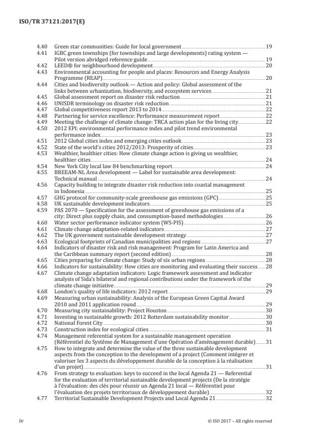ISO/TR 37121:2017 - Sustainable development in communities - is a Technical Report that compiles an inventory of existing guidelines, indicator sets and approaches for sustainable development and resilience in cities. First published in 2017, the report treats resilience as the ability of a city, system, community, local government or society exposed to hazards to resist, absorb, accommodate and recover from hazard effects in a timely and efficient manner, including preserving and restoring essential functions. The report is informational (technical report) and organizes a wide-ranging catalogue of tools, rating systems and monitoring frameworks to help cities measure and improve sustainability and resilience.