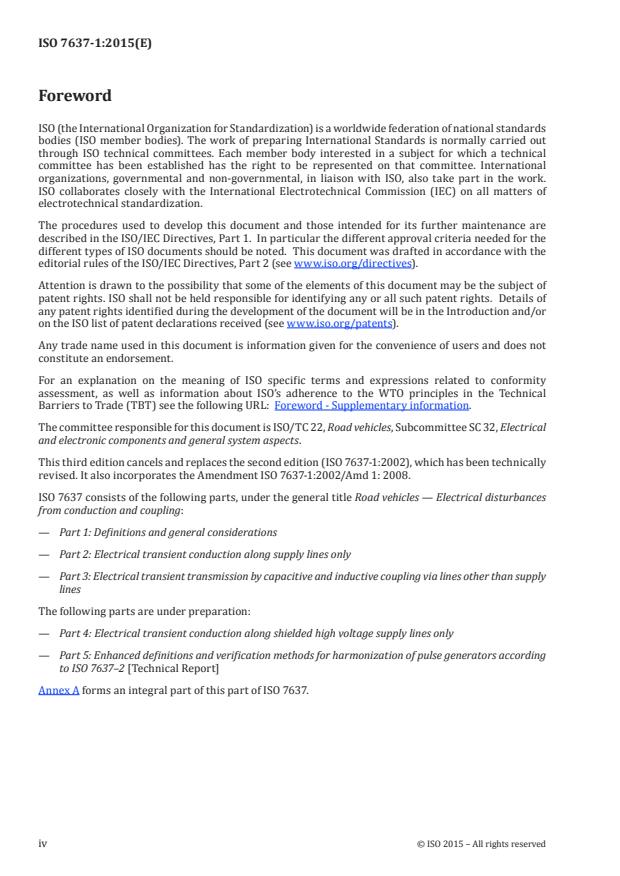 ISO 7637-1:2015 defines the basic terms relating to electrical disturbances from conduction and coupling used in the other parts of ISO 7637. It also gives general information on the whole ISO 7637 series.
