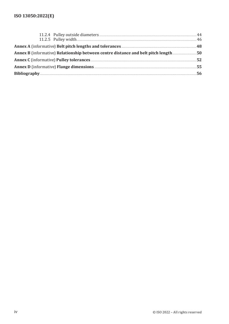 - Informative annexes on belt pitch length tolerances, centre-distance relationships, pulley tolerances and flange dimensions.