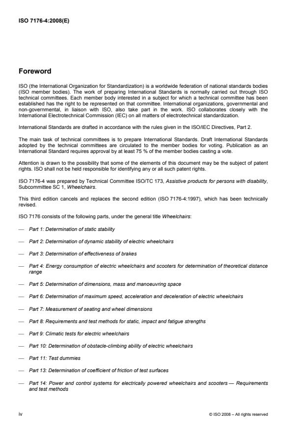 ISO 7176-4:2008 is a standard published by the International Organization for Standardization (ISO). Its full title is "Wheelchairs - Part 4: Energy consumption of electric wheelchairs and scooters for determination of theoretical distance range". This standard covers: ISO 7176-4:2008 specifies methods for determining theoretical distance range of electrically powered wheelchairs, including scooters, using measurements of energy consumed while driving and the nominal energy capacity of the wheelchair's battery set. It is applicable to electrically powered wheelchairs with a maximum nominal speed no greater than 15 km/h, intended to provide indoor and/or outdoor mobility for one disabled person whose mass is within the range represented by ISO 7176-11. ISO 7176-4:2008 also includes requirements for test reports and information disclosure.