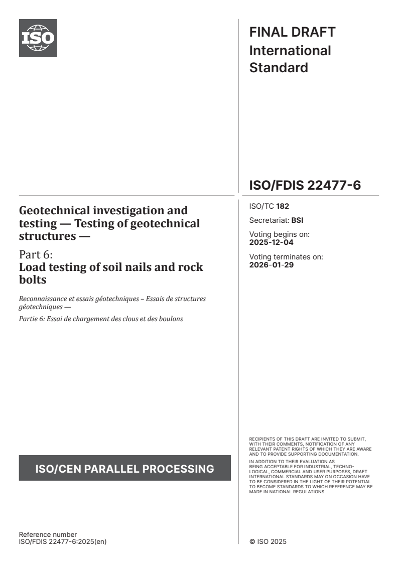 ISO/FDIS 22477-6 - Geotechnical investigation and testing — Testing of geotechnical structures — Part 6: Load testing of soil nails and rock bolts Released:20. 11. 2025