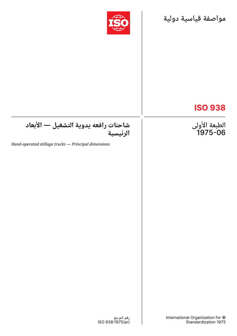 ISO 938:1975 - "Hand-operated stillage trucks - Principal dimensions" is an International Standard that defines the principal dimensional parameters for hand-operated stillage trucks so they are directly compatible with corresponding stillages. First published in 1975 (transformed from ISO Recommendation R 938-1969), the standard establishes maximum truck height and width, the basic length of the elevating frame, and standard lift increments and tolerances to ensure interoperability between trucks and stillages.