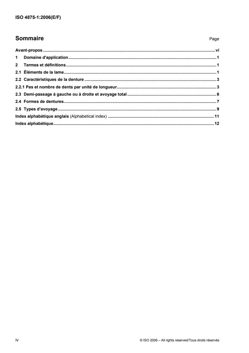 ISO 4875-1:2006 - "Metal-cutting band saw blades - Part 1: Vocabulary" is an International Organization for Standardization document that establishes a standardized vocabulary for terms relating to metal-cutting band saw blades. This second edition (2006) updates and replaces the 1978 edition and is subdivided into terms and definitions for blade elements, tooth characteristics, tooth shapes and set types. The standard includes illustrated definitions (figures) and metric conventions (e.g., pitch in millimetres).