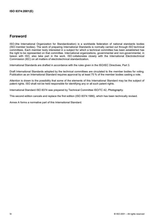 ISO 8374:2001 is a standard published by the International Organization for Standardization (ISO). Its full title is "Photography - Determination of ISO safelight conditions". This standard covers: This International Standard specifies the methods for determining the maximum exposure time that a given sensitized material can receive from a given safelight without affecting the quality of the final image. It also specifies the records which shall be maintained for the components of a safelight and its operating environment.