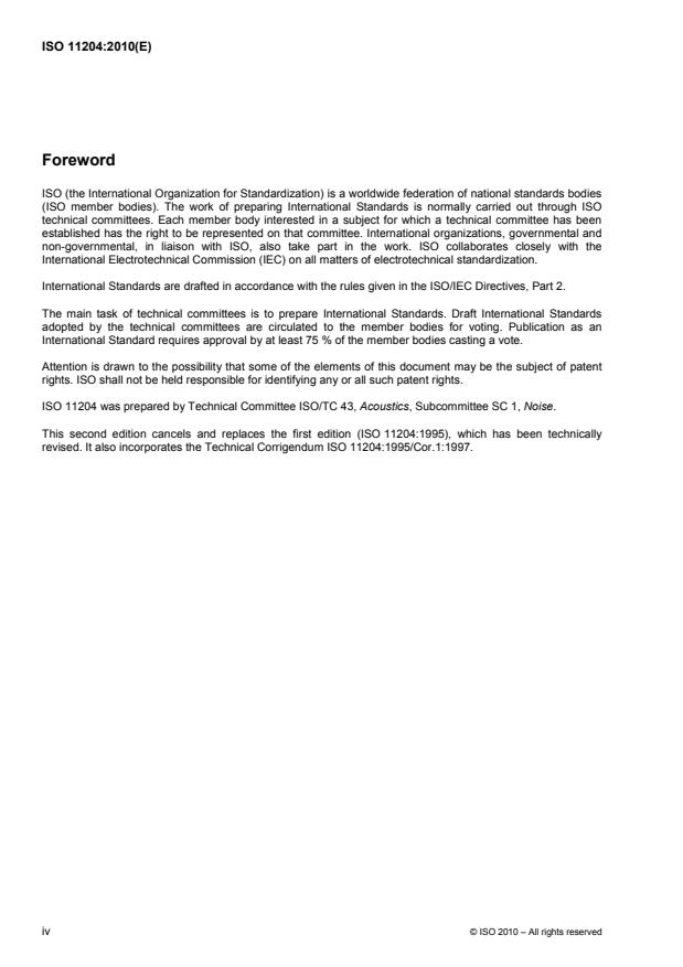 ISO 11204:2010 specifies a method for determining the emission sound pressure levels of machinery or equipment, at a work station and at other specified positions nearby, in any environment which meets certain qualification requirements. A work station is occupied by an operator and may be located in open space, in the room where the source under test operates, in a cab fixed to the source under test, or in an enclosure remote from the source under test. One or more specified positions may be located in the vicinity of a work station, or in the vicinity of an attended or unattended machine. Such positions are sometimes referred to as bystander positions. Emission sound pressure levels are determined as A-weighted levels. Additionally, levels in frequency bands and C-weighted peak emission sound pressure levels can be determined in accordance with ISO 11204:2010, if required. A method is given for determining a local environmental correction (subject to a specified limiting maximum value) to be applied to the measured sound pressure levels to exclude the effects of reflections from reflecting surfaces other than the plane on which the source under test is placed. This correction is based upon the mean sound pressure level on a measurement surface, the sound pressure level measured at a specified position, and either an environmental correction or the equivalent absorption area of the test room. With the method specified in ISO 11204:2010 results of accuracy grade 2 (engineering grade) or accuracy grade 3 (survey grade) are obtained. Corrections are applied for background noise and, as described above, for the acoustic environment. Instructions are given for the mounting and operation of the source under test and for the choice of microphone positions for the work station and for other specified positions. One purpose of the measurements is to permit comparison of the performance of different units of a given family of machines, under defined environmental conditions and standardized mounting and operating conditions. The method specified in ISO 11204:2010 is suitable for all types of noise (steady, non-steady, fluctuating, isolated bursts of sound energy, etc.) defined in ISO 12001. The method specified in ISO 11204:2010 is applicable to all types and sizes of noise sources. The type of test environment influences the accuracy of the determination of emission sound pressure levels. ISO 11204:2010 is applicable to an indoor or outdoor environment with one or more reflecting planes present, meeting specified requirements. These requirements on the room are less strict than those of ISO 11201, in particular regarding the acoustical quality of the environment. ISO 11204:2010 is applicable to work stations and other specified positions where emission sound pressure levels are to be determined. Appropriate positions where measurements may be made include the following: a) work station located in the vicinity of the source under test; this is the case for many industrial machines and domestic appliances; b) work station within a cab which is an integral part of the source under test; this is the case for many industrial trucks and earth-moving machines; c) work station within a partial or total enclosure (or behind a screen) supplied by the manufacturer as an integral part of the source under test; d) work station partially or totally enclosed by the source under test - this situation may be encountered with some large industrial machines; e) bystander positions occupied by individuals not responsible for the operation of the source under test, but who may be in its immediate vicinity, either occasionally or continuously; f) other specified positions, not necessarily work stations or bystander positions. The work station may also lie on a specified path along which an operator moves.