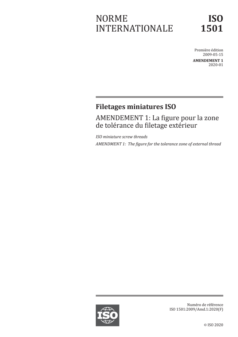ISO 1501:2009/Amd 1:2020 - Filetages miniatures ISO — Amendement 1: La figure pour la zone de tolérance du filetage extérieur Released:1/29/2020